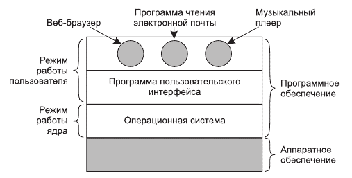 Современный компьютер состоит из одного или нескольких процессоров, оперативной памяти, дисков, принтера, клавиатуры, мыши, дисплея, сетевых интерфейсов и других разнообразных устройств ввода-вывода. В итоге получается довольно сложная система. Если каждому программисту, создающему прикладную программу, нужно будет разбираться во всех тонкостях работы всех этих устройств, то он не напишет ни строчки кода. Более того, управление всеми этими компонентами и их оптимальное использование представляет собой очень непростую задачу. По этой причине компьютеры оснащены специальным уровнем программного обеспечения, который называется операционной системой (ОС), в чью задачу входит управление пользовательскими программами, а также всеми ранее упомянутыми ресурсами. |