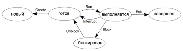 Будем считать, что состояние ("выделен", "не готова") является недостижимым для потока. То есть программе, не готовой к исполнению, процессор не выделяется. Более кратко эти состояния потока будем просто обозначать словами: "блокирован", "готов" и "выполняется". Для полноты картины нужно ввести для потоков еще два состояния: "новый" и "завершен", которые описывают соответственно поток, еще не начавший свою работу, и поток, завершивший свою работу. Тогда диаграмма возможных переходов потока из состояния в состояние может быть изображена, как это показано на рис. 2.1.