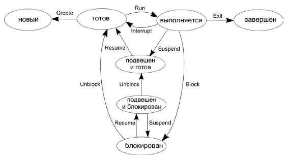 Используя эти операции, один поток может соответственно приостановить или возобновить исполнение другого потока независимо от того, в каком состоянии этот последний поток находится. Впрочем, заметим, что поток может приостановить и свое исполнение. Если над потоком выполнена операция Suspend, то будем говорить, что поток находится в приостановленном или подвешенном состоянии. Кратко будем говорить, что в этом случае поток "подвешен". Дополним диаграмму состояний потока, изображенную на рис. 2.1, этими новыми операциями и состояниями. Получим более полную диаграмму состояний потока, которая показана на рис. 2.2. ![]() Рис. 2.2. Модель семи состояний потока |
