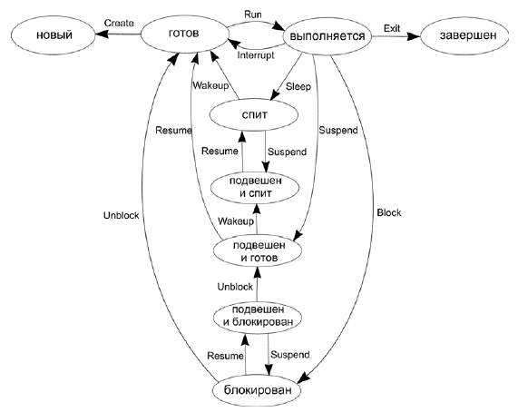 В результате можно построить полную диаграмму состояний потока, которая и приведена на рис. 2.3. ![]() Рис. 2.3. Модель девяти состояний потока В заключение этого параграфа скажем, что в конкретных операционных системах для работы с потоками могут быть определены и другие состояния, а также операции, которые переводят поток в эти состояния. |